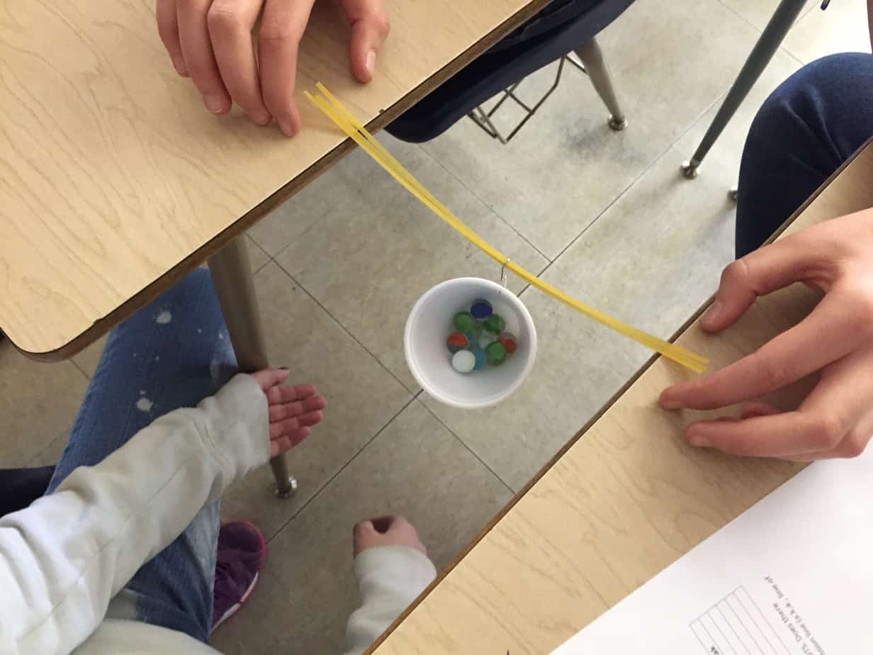 Students attached a styrofoam cup to a twisted paper clip. The cup was then lowered over a predetermined number of strands of uncooked spaghetti.