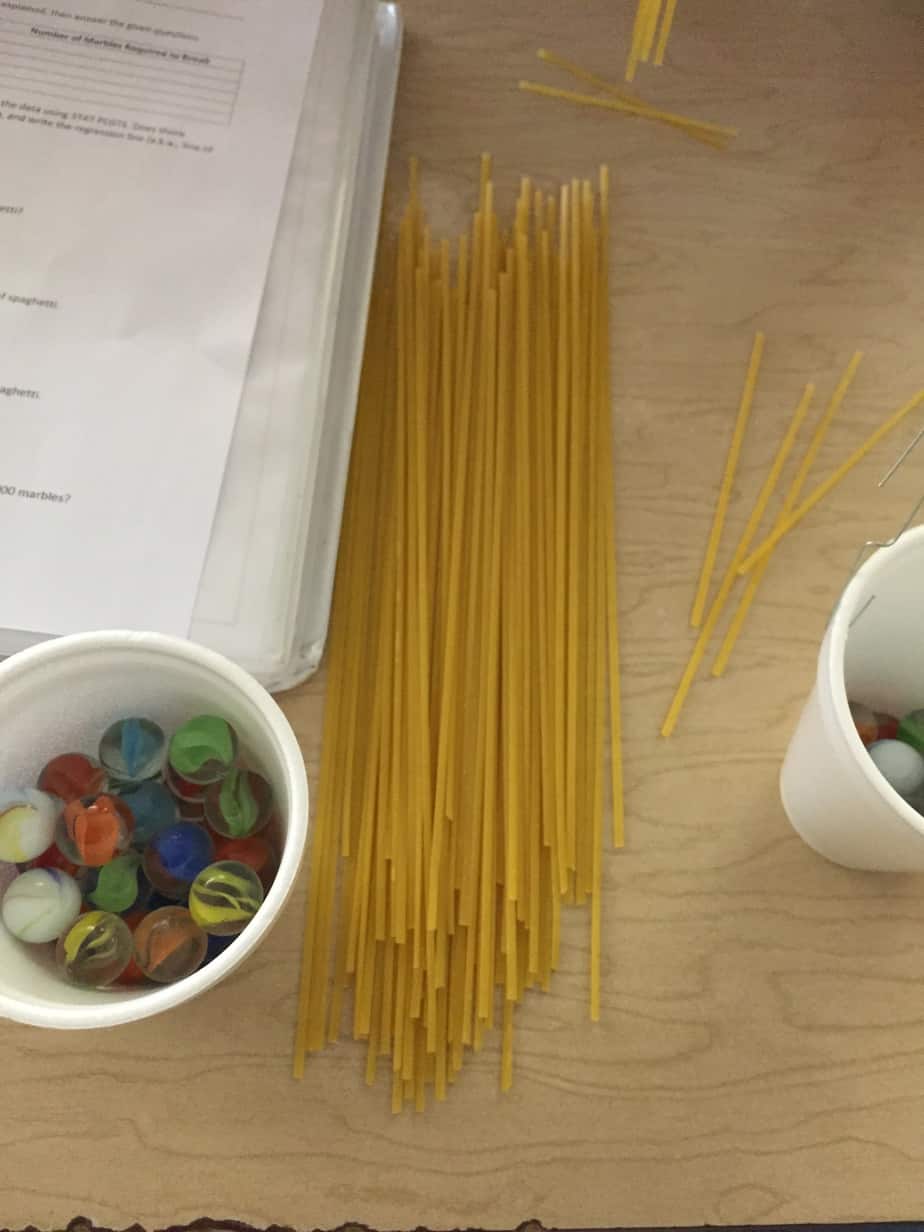 After that, the brainy part started. Students used TI-84 graphing calculators to input the data that they gathered. Once the data were entered, they performed linear regression. Since there was a strong positive correlation, they were able to use their linear model to predict the number of marbles required to break x strands of spaghetti.